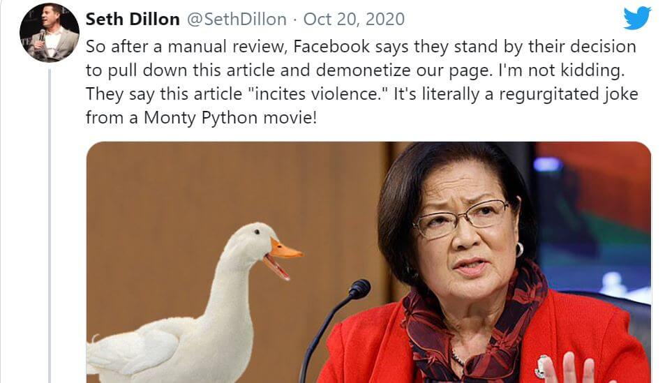 Facebook had demonetized the Babylon Bee's account over a Monty Python joke. ...