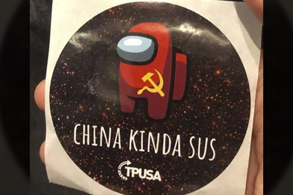 The stickers prominently featured a hammer and sickle and read, “China Kinda Sus” — a reference to the popular online game Among Us in which players seek to guess who the enemy is (in the game, “sus” is slang/shorthand for “suspect” or “suspicious”).